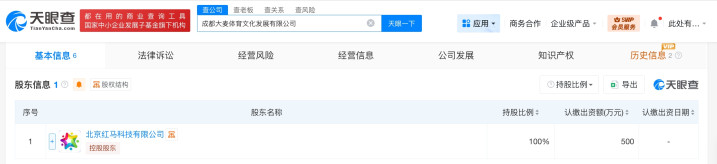 每经AI快讯好易配资,天眼查App显示,近日,成都大麦体育文化发展有限公司成立,法定代表人为王依楠,注册资本500万元人民币,经营范围含体育赛事策划、体育竞赛组织、体育中介代理服务、体育经纪人服务、组织体育表演活动、票务代理服务、体育保障组织、信息咨询服务等。股东信息显示,该公司由北京红马科技有限公司全资持股。